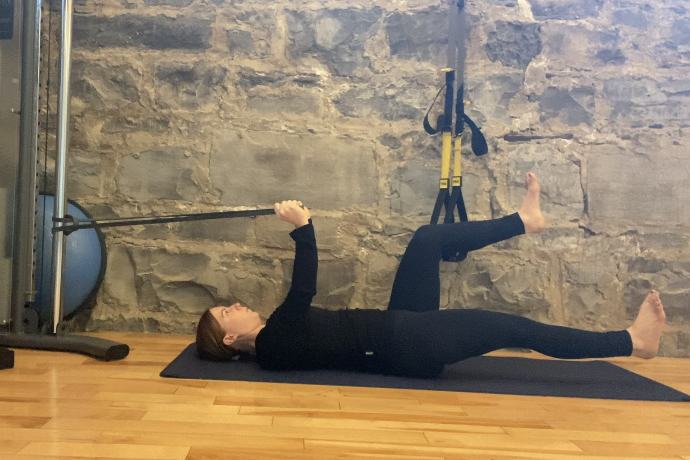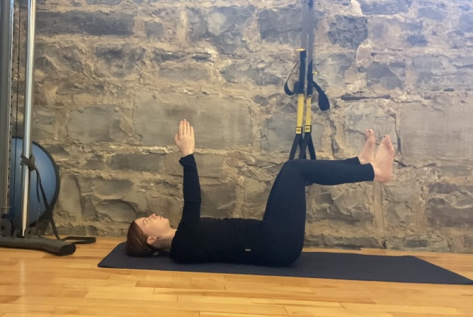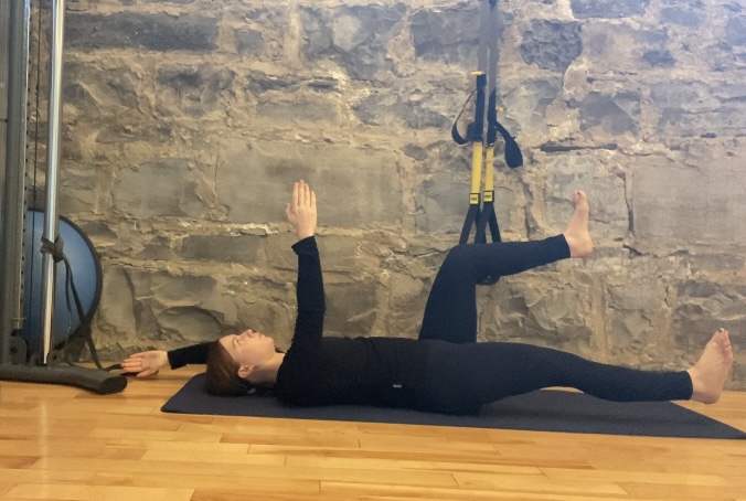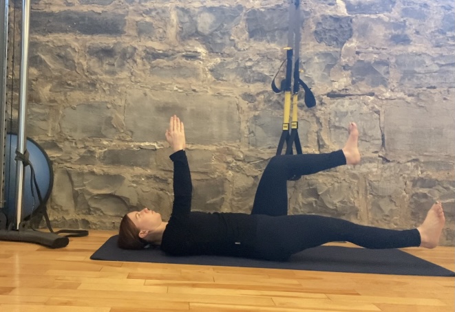 knees bent at 90 degree angles off the floor. Check in with your lower back to ensure it remains pressed into the floor throughout the entire movement. Take a deep breath in, and then on the exhale straighten one leg at a time so it hovers above the floor. After you’ve exhaled completely, repeat with the other leg.