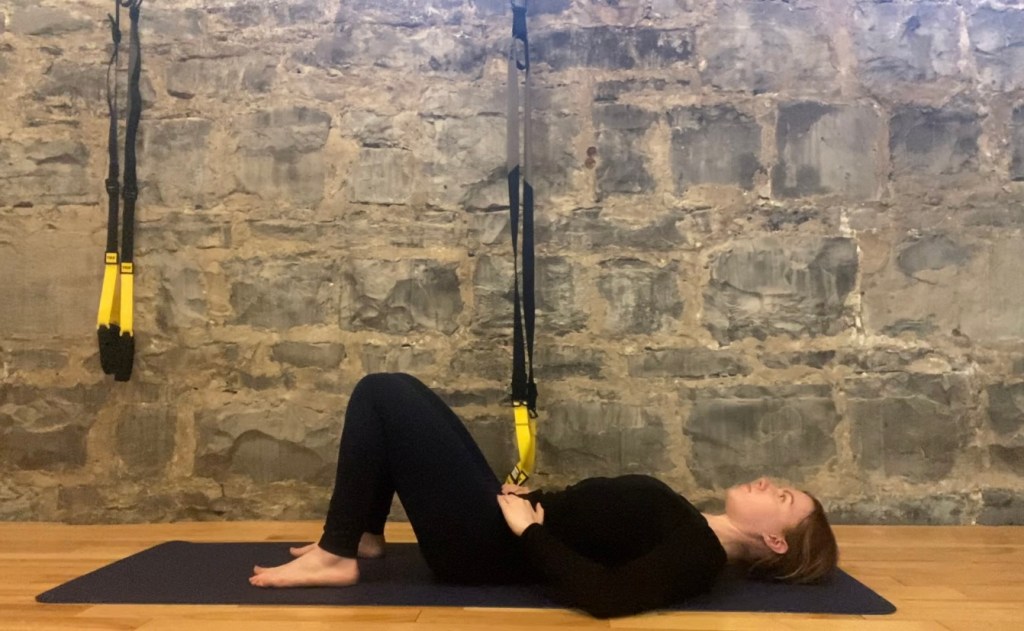 Take a deep inhale through your nose and expand your belly, ribcage and chest. Pause for a
